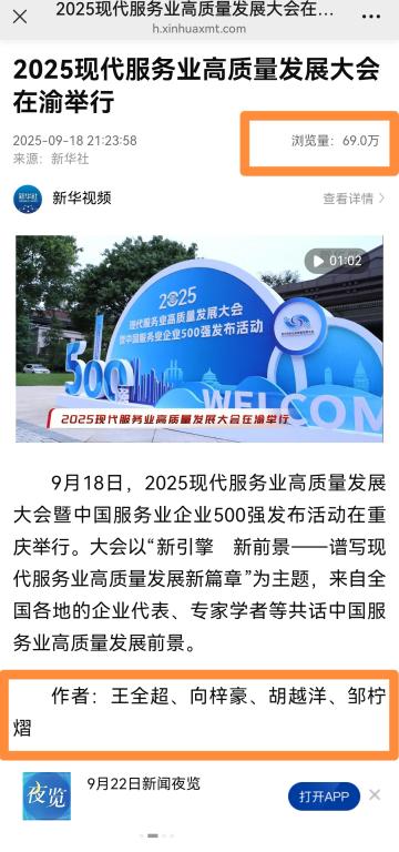 9月18日,2025现代服务业高质量发展大会暨中国服务业企业500强发布活动在山城重庆璀璨启幕。这场备受瞩目的行业盛典,不仅吸引了众多业界翘楚齐聚一堂,更为高校学子搭建了近距离接触产业脉搏、锤炼专业技能的高端平台。我校新媒体艺术学院学子邹柠熠、向梓豪、胡越洋凭借扎实的专业功底与出色的综合素养,受邀承担此次大会的核心视觉记录与媒体传播重任,以专业实践充分展现学院育人风采。