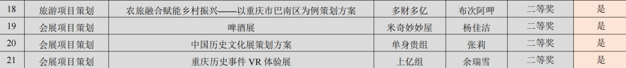 在第十九届全国大学生文旅与会展创新创业实践竞赛重庆市赛中,会展学子生聚焦行业热点,提交多份优质作品,共获二等奖8项,均入围全国总决赛。