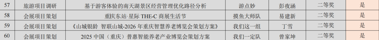 在第十四届重庆高校会展技能大赛中,会务组精准完成会议摆台,展现专业服务素养,获特等奖1项、一等奖1项、二等奖1项;设计组学子融合新媒体艺术,打造完整 VI 设计方案,获特等奖1项、三等奖2项;策划组学子通过方案陈述与答辩,彰显扎实策划能力,获二等奖1项、三等奖3项。