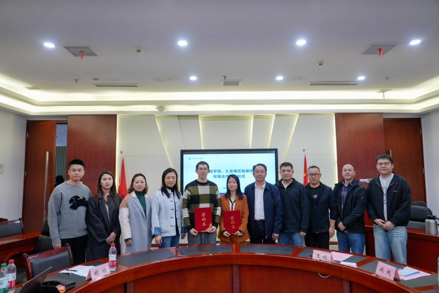 为深化产教融合、创新人才培养模式,携手助力区域传媒事业发展,2025年11月12日下午,我校新媒体艺术学院与九龙坡区融媒体中心校媒合作签约暨“产教融合实习基地”授牌仪式圆满举行。双方将整合资源优势,共同探索校媒协同育人的新路径,培养适应全媒体时代需求的高素质应用型传媒人才。