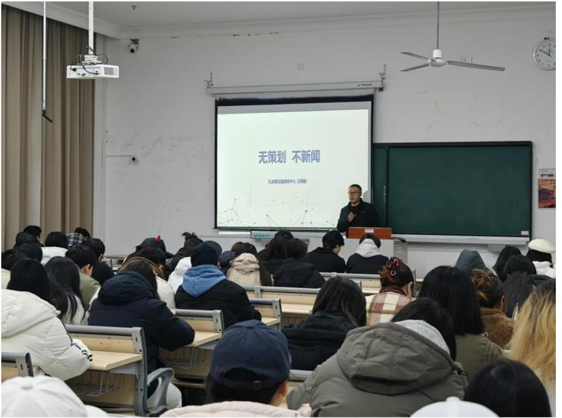 九龙坡区融媒体中心的王炳瑜主任作为业界指导老师,为23级网络与新媒体专业1、3、4、5班的同学开展了一场线下新闻主题创作的经验分享与任务发布活动。